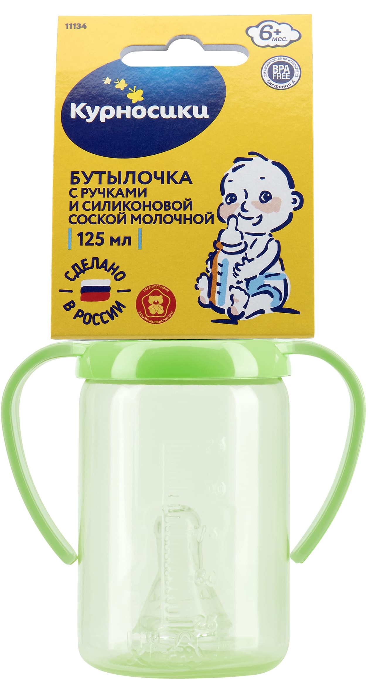 Купите Курносики 11134 Бутылочка для кормления с ручками и силиконовой соской молочной, 125 мл. в аптеках города Астана, Алматы, Кокшетау, Шымкент, Тараз, Кызылорда, Туркестан отправьте чек и получите бонус 10%.